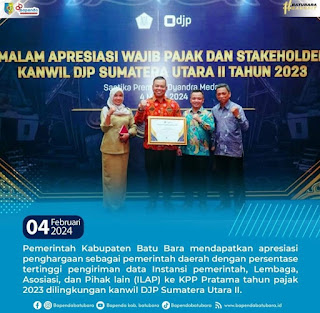 Trilo, Batubara,- Pemerintah Kabupaten Batu Bara mendapatkan apresiasi penghargaan sebagai pemerintah daerah dengan persentase tertinggi pengiriman data Instansi pemerintah, Lembaga, Asosiasi, dan Pihak lain (ILAP) ke KPP Pratama tahun pajak 2023 dilingkungan kanwil DJP Sumatera Utara II.